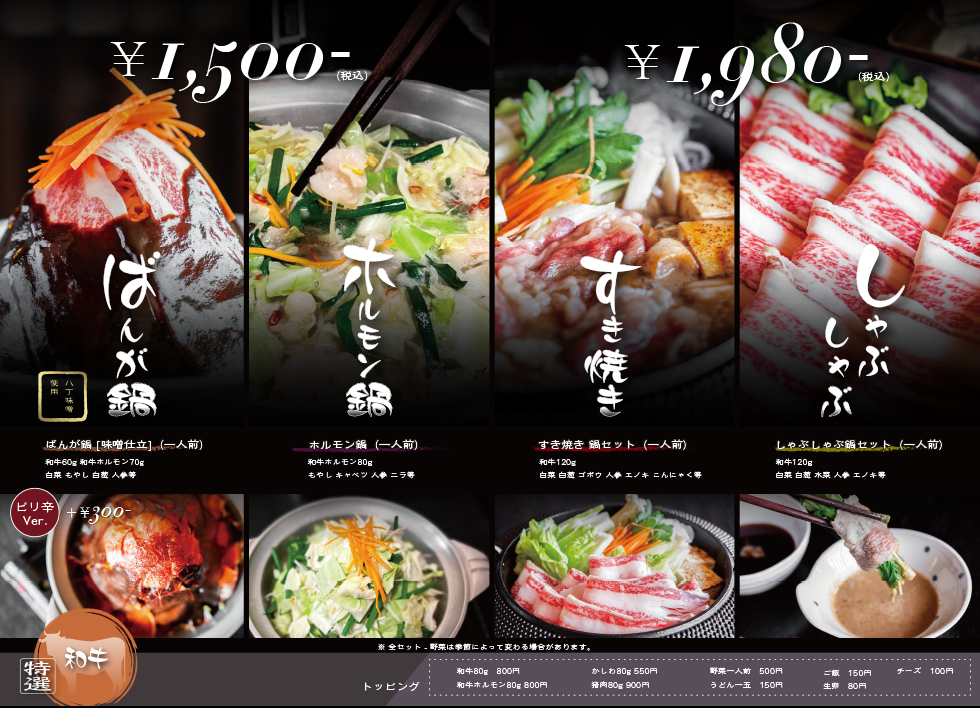 国産和牛をふんだんに使った「すき焼き」「しゃぶしゃぶ」の他に、当店自慢の「ばんが鍋」「ホルモン鍋」の4セットをご用意しております。